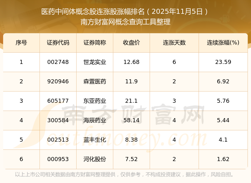 2025年11月5日醫(yī)藥中間體概念股連漲股漲幅排名