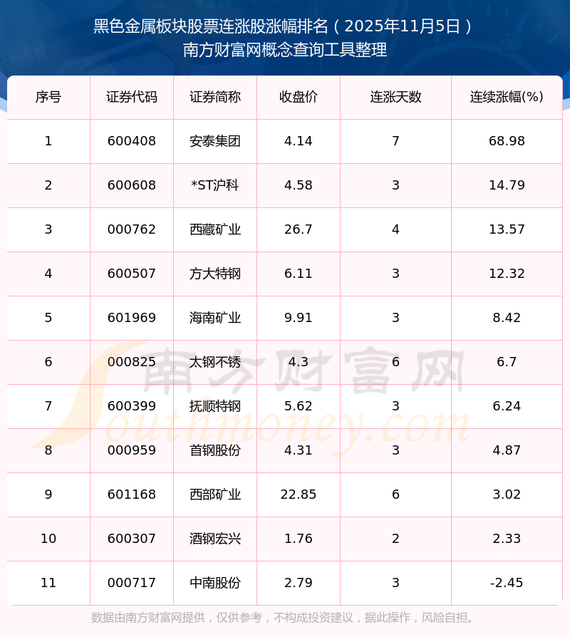 2025年11月5日黑色金屬板塊股票連漲股漲幅排名
