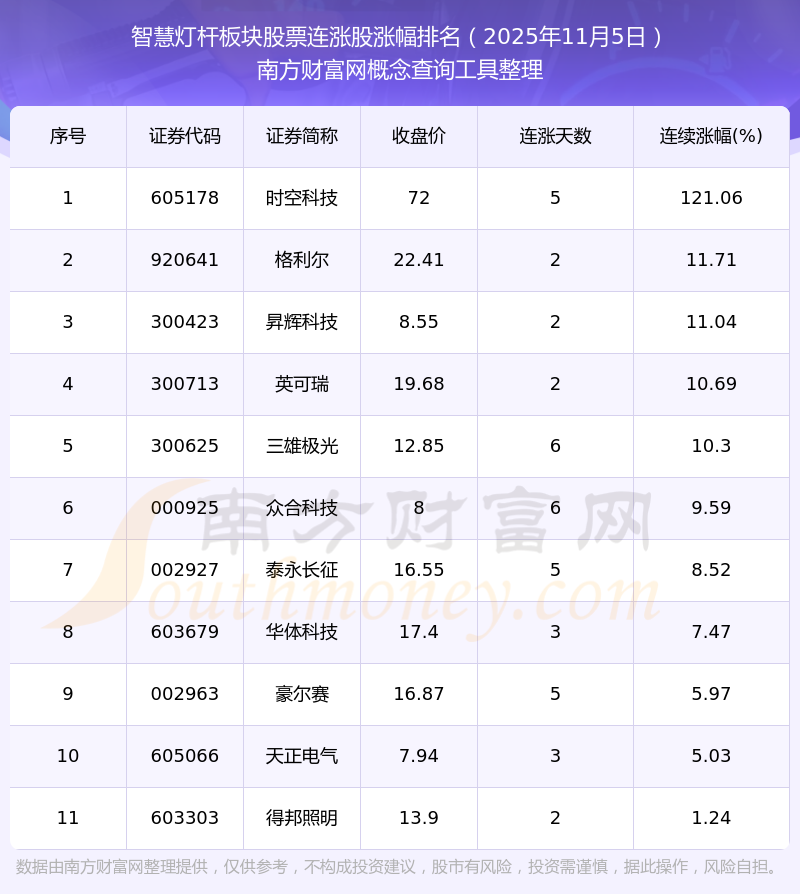 2025年11月5日智慧燈桿板塊股票連漲股漲幅排名