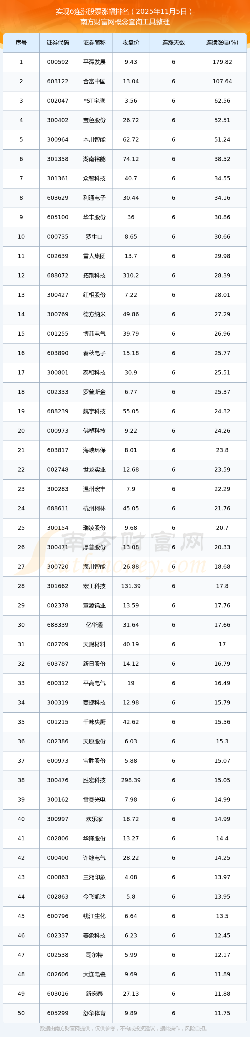 根據(jù)南方財(cái)富網(wǎng)概念查詢工具數(shù)據(jù)統(tǒng)計(jì),截止2025年11月5日收盤(pán),共有109只個(gè)股實(shí)現(xiàn)6天連漲。其中連續(xù)漲幅較大的個(gè)股有平潭發(fā)展、合富中國(guó)、*ST寶鷹等,連續(xù)漲幅分別為179.82%、107.64%、62.56%。