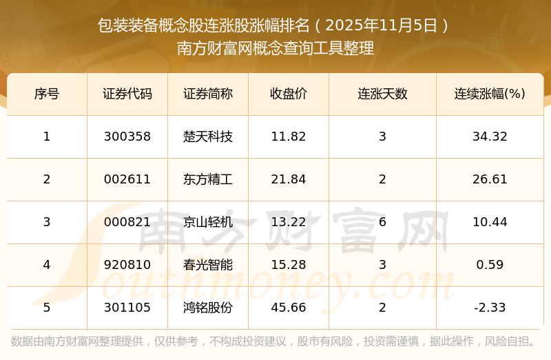 2025年11月5日包裝裝備概念股連漲股漲幅排名