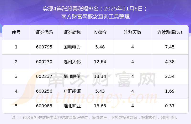根據南方財富網概念查詢工具數據統計,截止2025年11月6日收盤,共有5只個股實現4天連漲。其中連續(xù)漲幅較大的個股有國電電力、滄州大化、恒邦股份等,連續(xù)漲幅分別為7.45%、4.38%、2.54%。