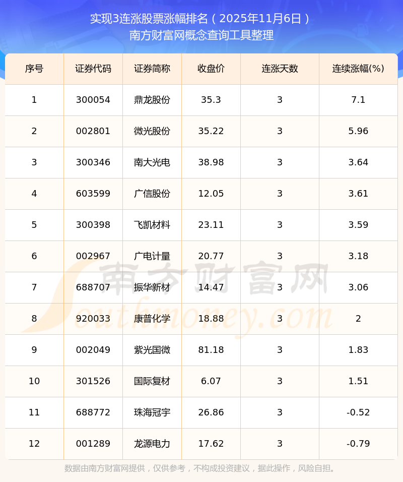 2025年11月6日實(shí)現(xiàn)3連漲股票漲幅排名