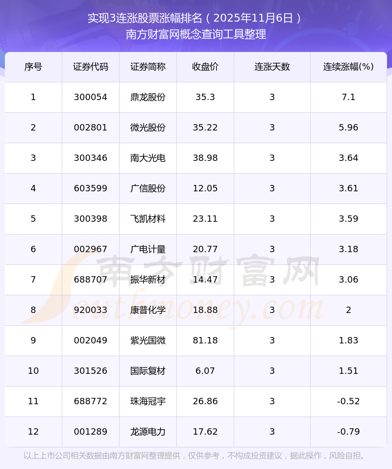2025年11月6日實現(xiàn)3連漲股票漲幅排名