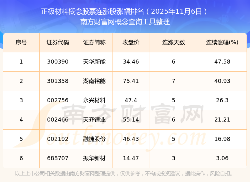根據(jù)南方財富網(wǎng)概念查詢工具數(shù)據(jù)統(tǒng)計,截止2025年11月6日收盤,正極材料概念股票共有6只個股實現(xiàn)連漲。其中連續(xù)漲幅較大的個股有天華新能、湖南裕能、永興材料等,連續(xù)漲幅分別為47.58%、40.93%、26.30%。