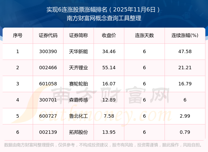 根據(jù)南方財富網(wǎng)概念查詢工具數(shù)據(jù)統(tǒng)計,截止2025年11月6日收盤,共有6只個股實現(xiàn)6天連漲。其中連續(xù)漲幅較大的個股有天華新能、天齊鋰業(yè)、賽輪輪胎等,連續(xù)漲幅分別為47.58%、21.21%、16.79%。