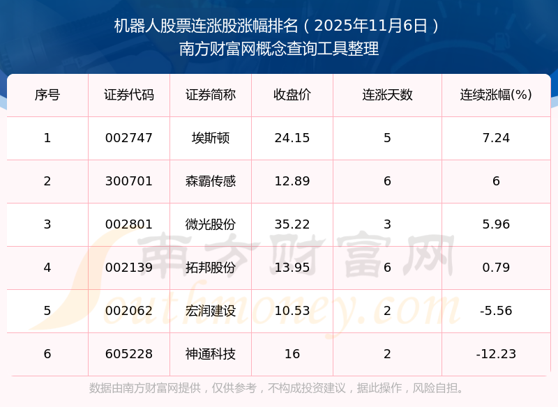 根據(jù)南方財(cái)富網(wǎng)概念查詢工具數(shù)據(jù)統(tǒng)計(jì),截止2025年11月6日收盤,機(jī)器人股票共有6只個(gè)股實(shí)現(xiàn)連漲。其中連續(xù)漲幅較大的個(gè)股有埃斯頓、森霸傳感、微光股份等,連續(xù)漲幅分別為7.24%、6.00%、5.96%。