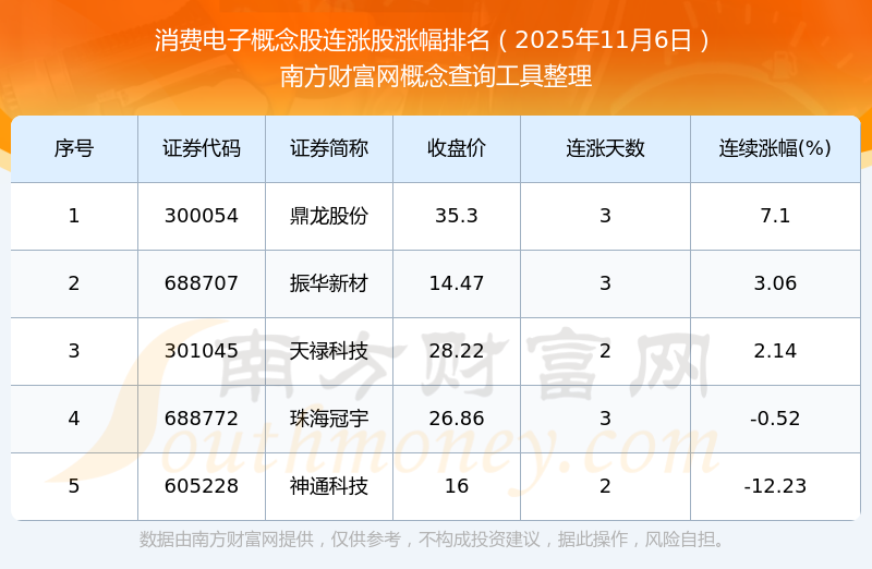 根據(jù)南方財(cái)富網(wǎng)概念查詢工具數(shù)據(jù)統(tǒng)計(jì),截止2025年11月6日收盤,消費(fèi)電子概念股共有5只個(gè)股實(shí)現(xiàn)連漲。其中連續(xù)漲幅較大的個(gè)股有鼎龍股份、振華新材、天祿科技等,連續(xù)漲幅分別為7.10%、3.06%、2.14%。