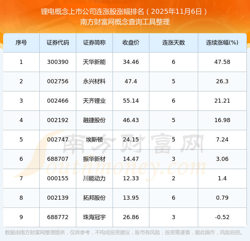 2025年11月6日鋰電概念上市公司連漲股漲幅排名