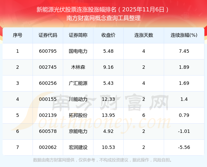 根據(jù)南方財富網(wǎng)概念查詢工具數(shù)據(jù)統(tǒng)計,截止2025年11月6日收盤,新能源光伏股票共有7只個股實現(xiàn)連漲。其中連續(xù)漲幅較大的個股有國電電力、木林森、廣匯能源等,連續(xù)漲幅分別為7.45%、1.89%、1.69%。