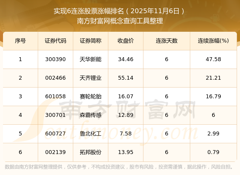 根據(jù)南方財(cái)富網(wǎng)概念查詢工具數(shù)據(jù)統(tǒng)計(jì),截止2025年11月6日收盤,共有6只個(gè)股實(shí)現(xiàn)6天連漲。其中連續(xù)漲幅較大的個(gè)股有天華新能、天齊鋰業(yè)、賽輪輪胎等,連續(xù)漲幅分別為47.58%、21.21%、16.79%。 2025年11月6日實(shí)現(xiàn)6連漲股票漲幅排名 以上上市公司相關(guān)數(shù)據(jù)由南方