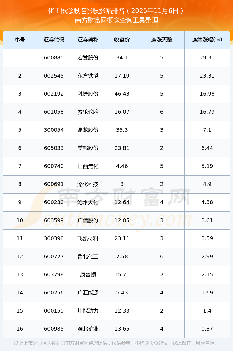 根據(jù)南方財(cái)富網(wǎng)概念查詢工具數(shù)據(jù)統(tǒng)計(jì),截止2025年11月6日收盤,化工概念股共有16只個(gè)股實(shí)現(xiàn)連漲。其中連續(xù)漲幅較大的個(gè)股有宏發(fā)股份、東方鐵塔、融捷股份等,連續(xù)漲幅分別為29.31%、23.31%、16.98%。