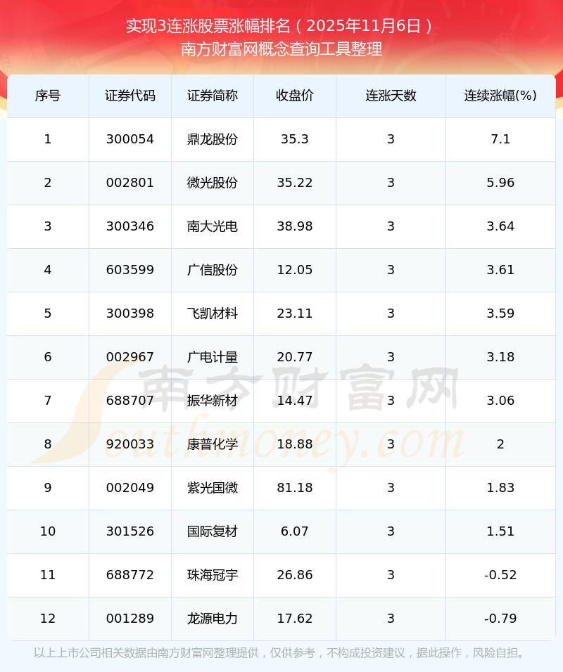 2025年11月6日實現(xiàn)3連漲股票漲幅排名