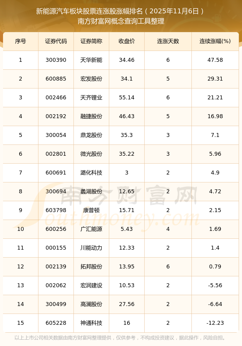 2025年11月6日新能源汽車板塊股票連漲股漲幅排名
