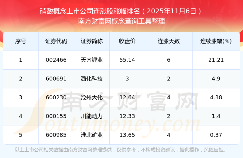 根據(jù)南方財(cái)富網(wǎng)概念查詢工具數(shù)據(jù)統(tǒng)計(jì),截止2025年11月6日收盤,硝酸概念上市公司共有5只個(gè)股實(shí)現(xiàn)連漲。其中連續(xù)漲幅較大的個(gè)股有天齊鋰業(yè)、潞化科技、滄州大化等,連續(xù)漲幅分別為21.21%、4.90%、4.38%。