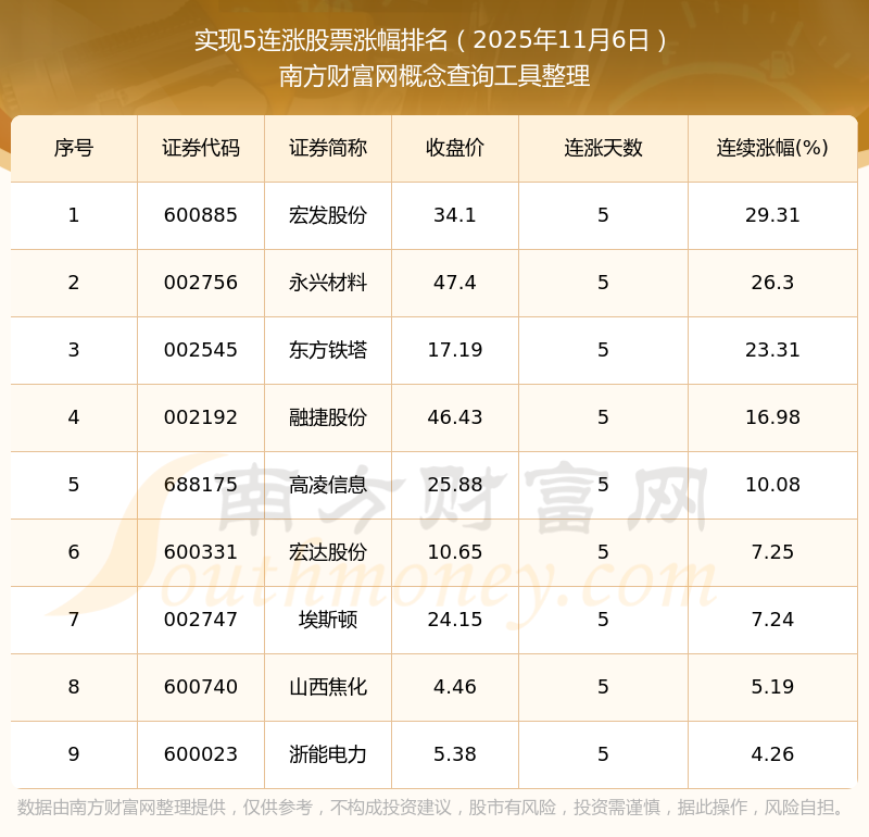 2025年11月6日實(shí)現(xiàn)5連漲股票漲幅排名