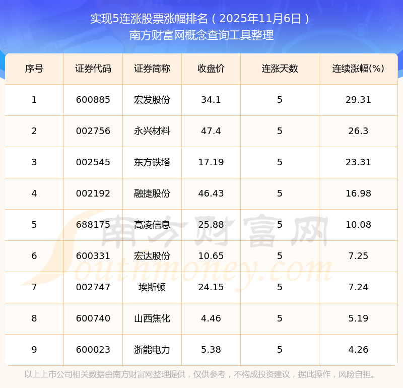 根據(jù)南方財富網(wǎng)概念查詢工具數(shù)據(jù)統(tǒng)計,截止2025年11月6日收盤,共有9只個股實現(xiàn)5天連漲。其中連續(xù)漲幅較大的個股有宏發(fā)股份、永興材料、東方鐵塔等,連續(xù)漲幅分別為29.31%、26.30%、23.31%。