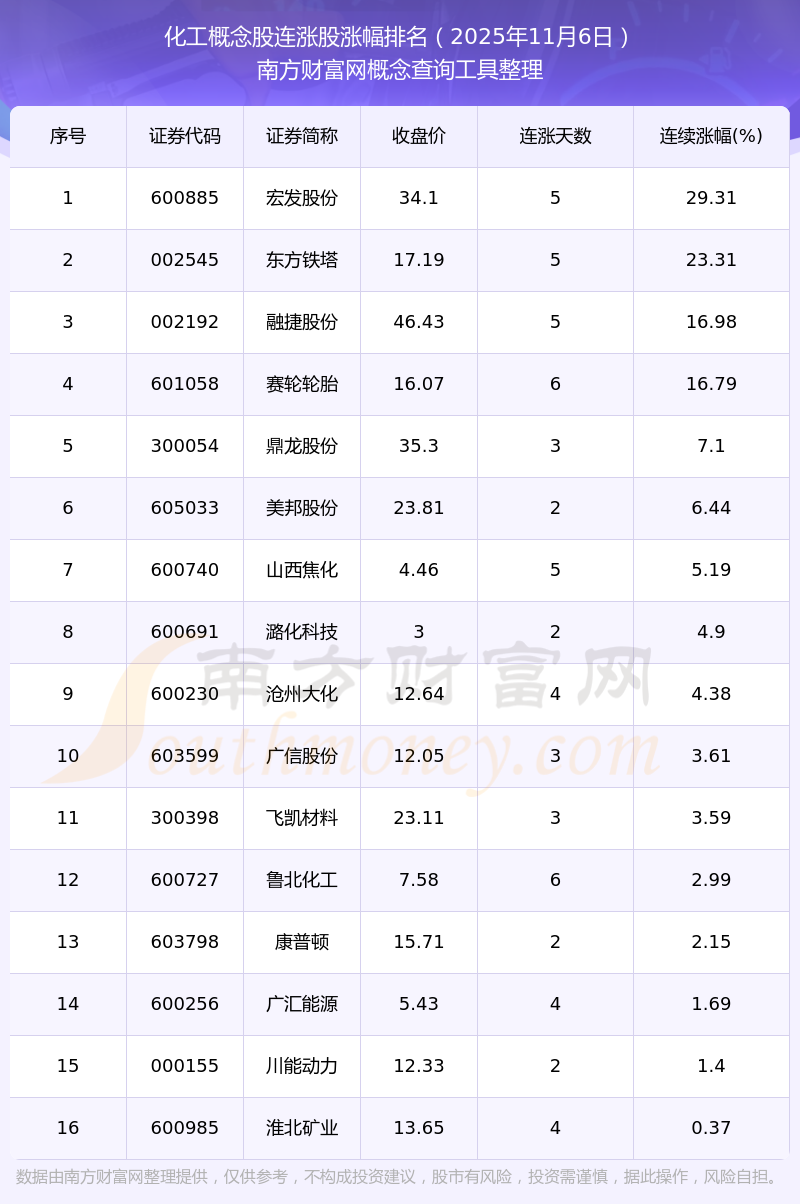 根據(jù)南方財(cái)富網(wǎng)概念查詢工具數(shù)據(jù)統(tǒng)計(jì),截止2025年11月6日收盤,化工概念股共有16只個股實(shí)現(xiàn)連漲。其中連續(xù)漲幅較大的個股有宏發(fā)股份、東方鐵塔、融捷股份等,連續(xù)漲幅分別為29.31%、23.31%、16.98%。