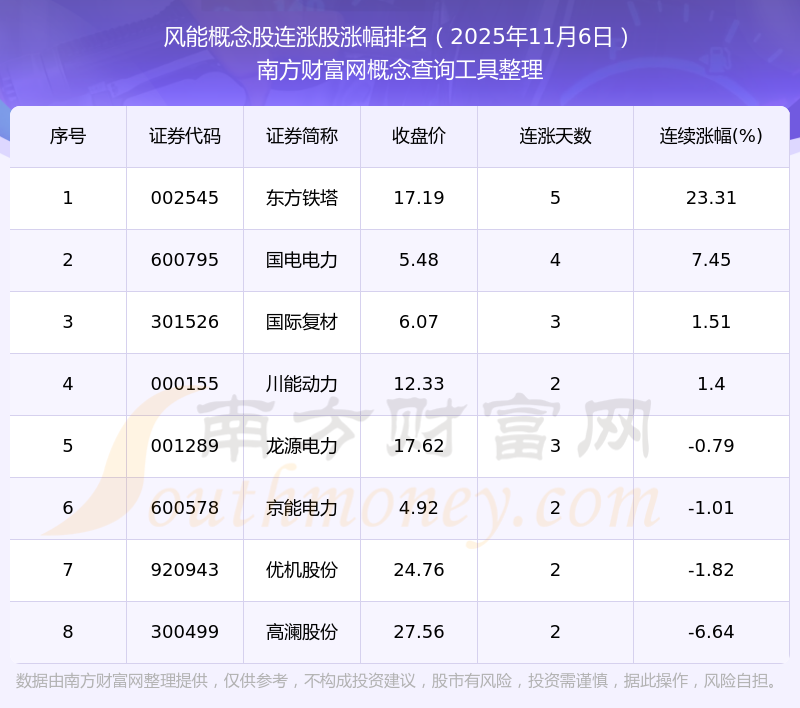 根據(jù)南方財富網(wǎng)概念查詢工具數(shù)據(jù)統(tǒng)計,截止2025年11月6日收盤,風(fēng)能概念股共有8只個股實現(xiàn)連漲。其中連續(xù)漲幅較大的個股有東方鐵塔、國電電力、國際復(fù)材等,連續(xù)漲幅分別為23.31%、7.45%、1.51%。