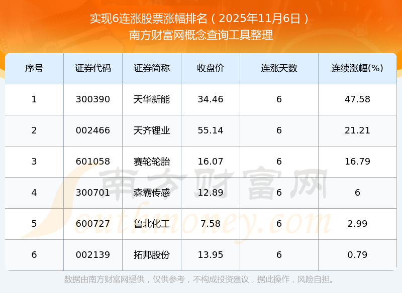根據(jù)南方財(cái)富網(wǎng)概念查詢(xún)工具數(shù)據(jù)統(tǒng)計(jì),截止2025年11月6日收盤(pán),共有6只個(gè)股實(shí)現(xiàn)6天連漲。其中連續(xù)漲幅較大的個(gè)股有天華新能、天齊鋰業(yè)、賽輪輪胎等,連續(xù)漲幅分別為47.58%、21.21%、16.79%。