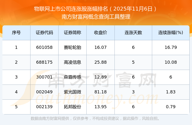 2025年11月6日物聯(lián)網(wǎng)上市公司連漲股漲幅排名