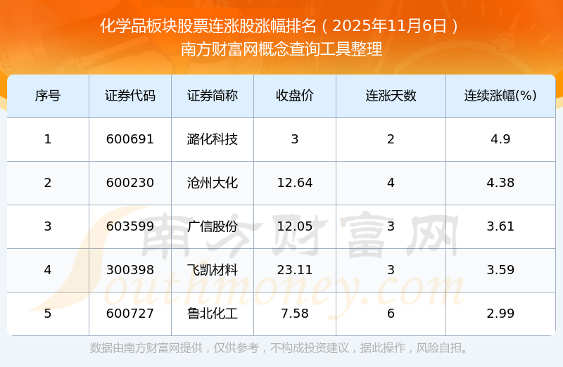 2025年11月6日化學(xué)品板塊股票連漲股漲幅排名