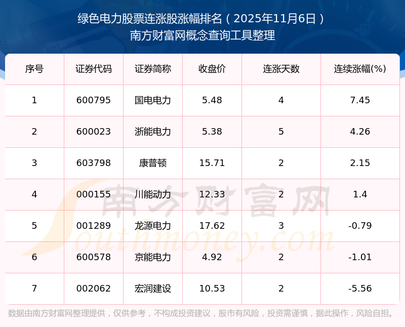 2025年11月6日綠色電力股票連漲股漲幅排名