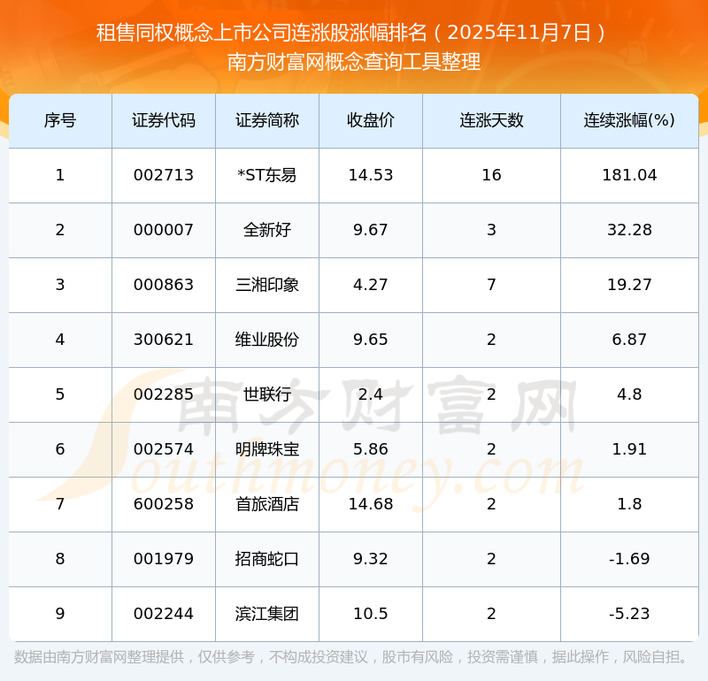 2025年11月7日租售同權(quán)概念上市公司連漲股漲幅排名