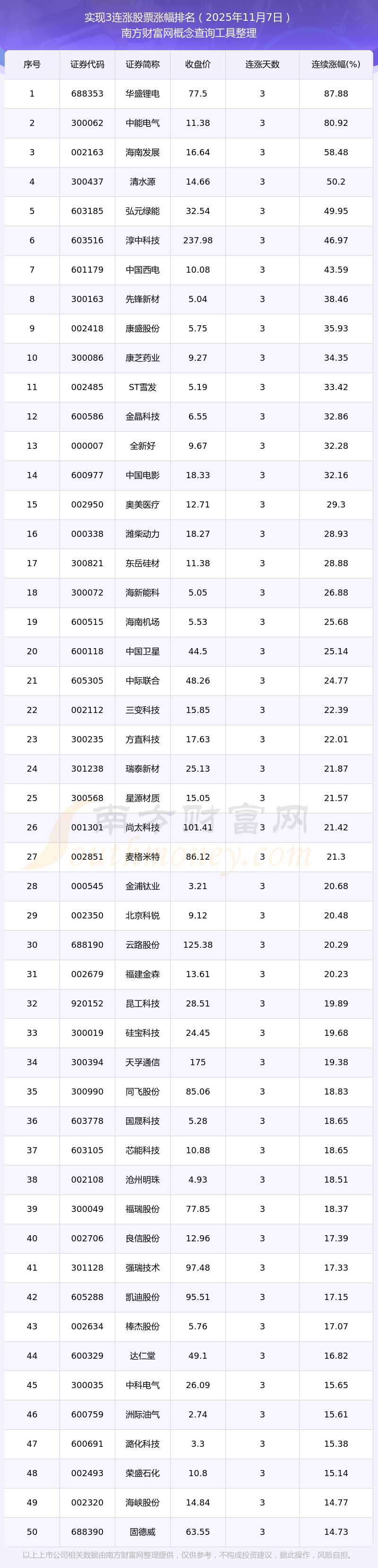 2025年11月7日實現(xiàn)3連漲股票漲幅排名