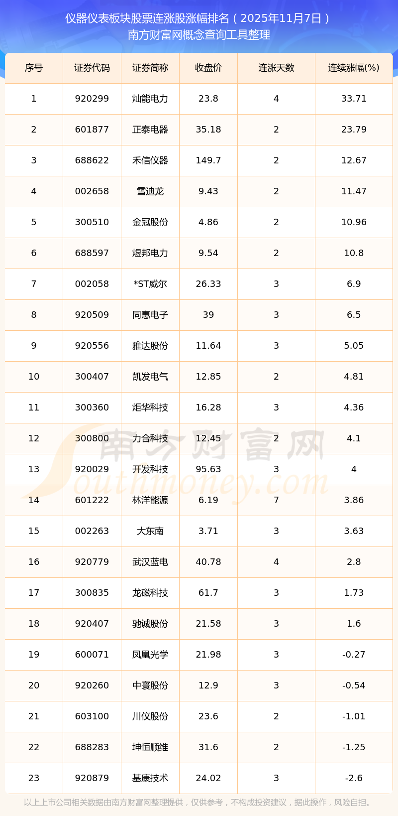 2025年11月7日儀器儀表板塊股票連漲股漲幅排名