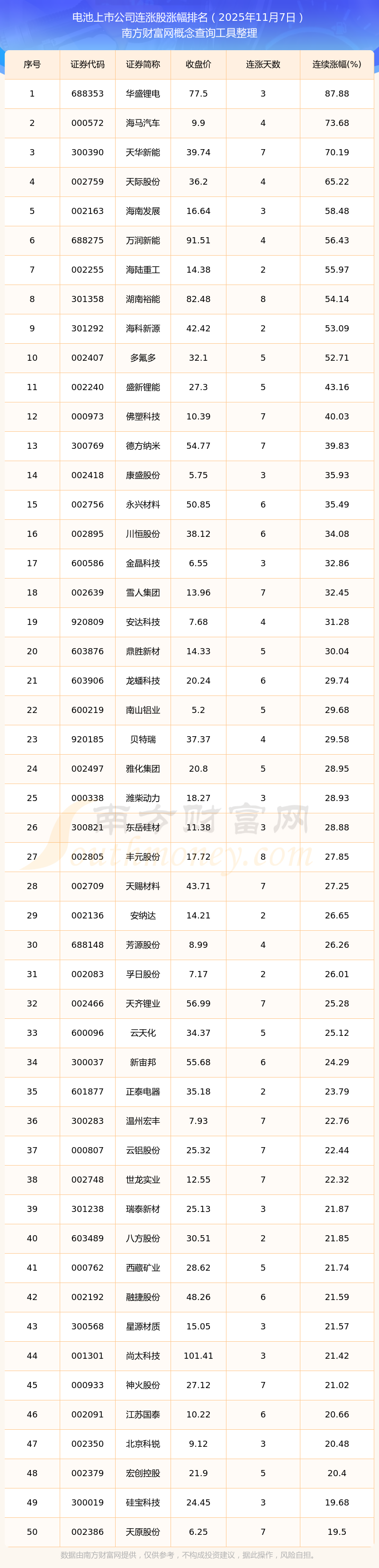 2025年11月7日電池上市公司連漲股漲幅排名