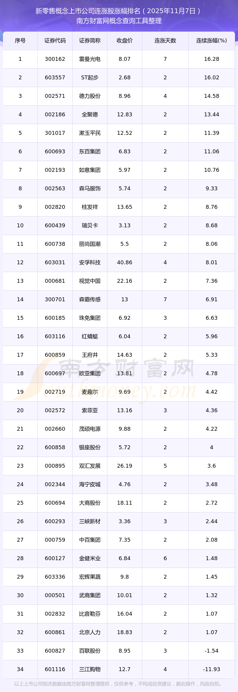 2025年11月7日新零售概念上市公司連漲股漲幅排名