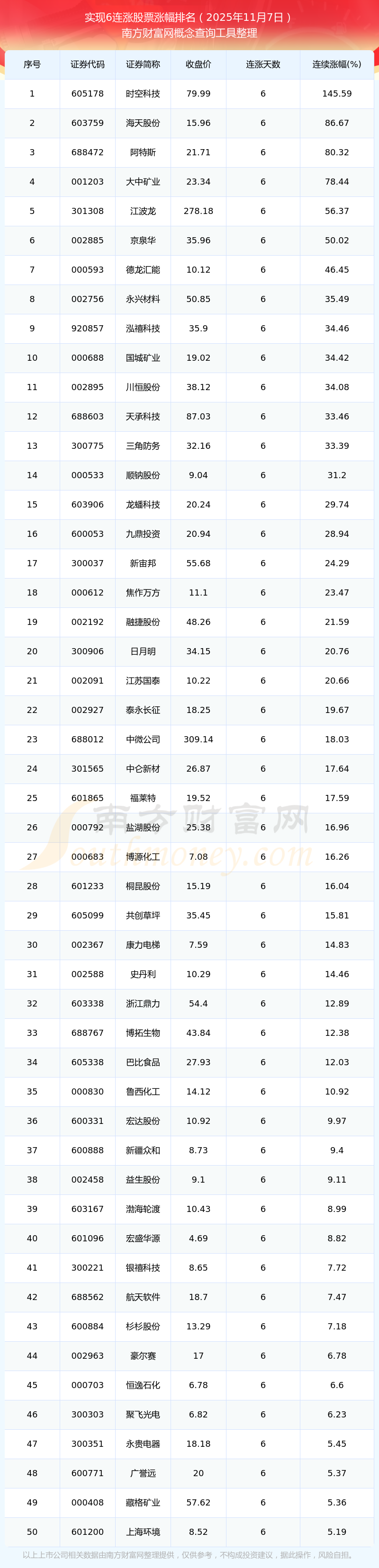 根據(jù)南方財(cái)富網(wǎng)概念查詢工具數(shù)據(jù)統(tǒng)計(jì),截止2025年11月7日收盤,共有77只個(gè)股實(shí)現(xiàn)6天連漲。其中連續(xù)漲幅較大的個(gè)股有時(shí)空科技、海天股份、阿特斯等,連續(xù)漲幅分別為145.59%、86.67%、80.32%。