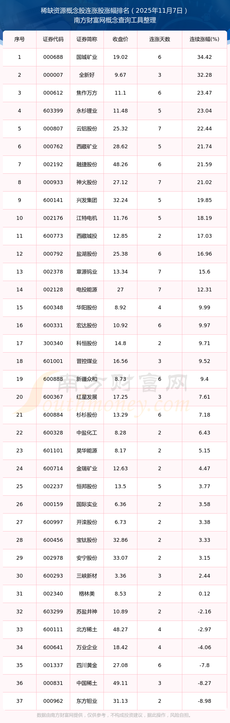 根據(jù)南方財(cái)富網(wǎng)概念查詢工具數(shù)據(jù)統(tǒng)計(jì),截止2025年11月7日收盤(pán),稀缺資源概念股共有37只個(gè)股實(shí)現(xiàn)連漲。其中連續(xù)漲幅較大的個(gè)股有國(guó)城礦業(yè)、全新好、焦作萬(wàn)方等,連續(xù)漲幅分別為34.42%、32.28%、23.47%。