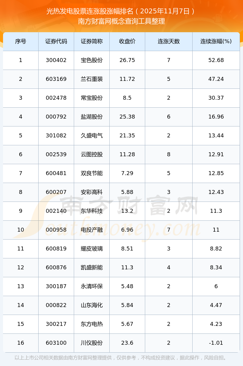 2025年11月7日光熱發(fā)電股票連漲股漲幅排名