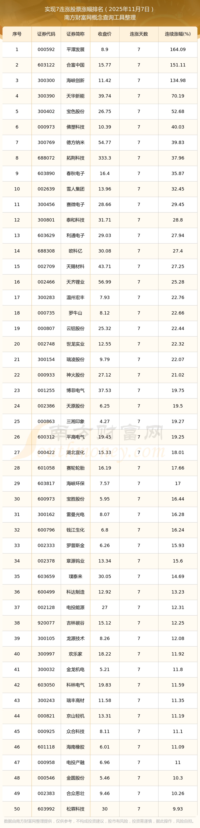 2025年11月7日實現(xiàn)7連漲股票漲幅排名