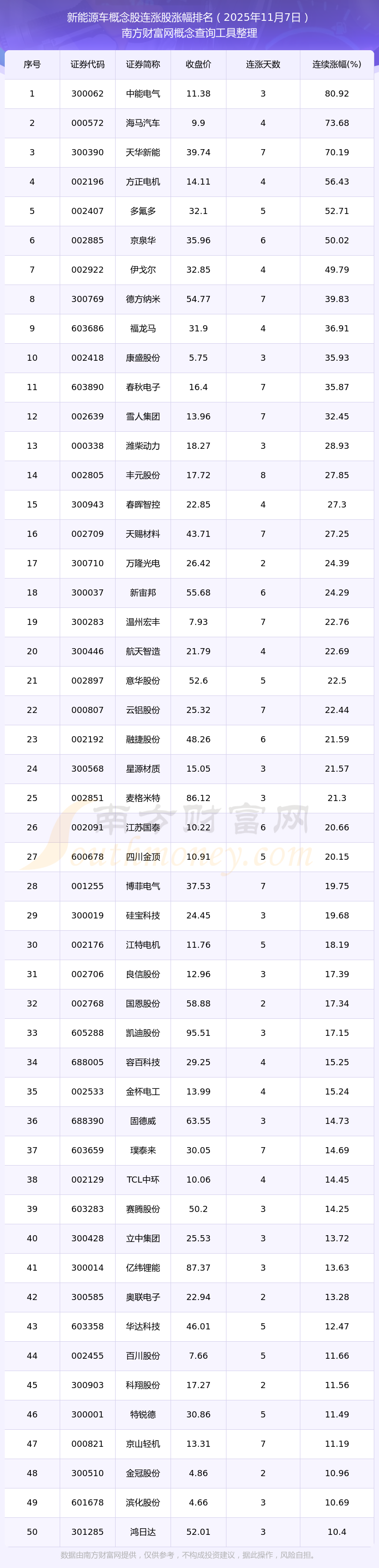 2025年11月7日新能源車概念股連漲股漲幅排名