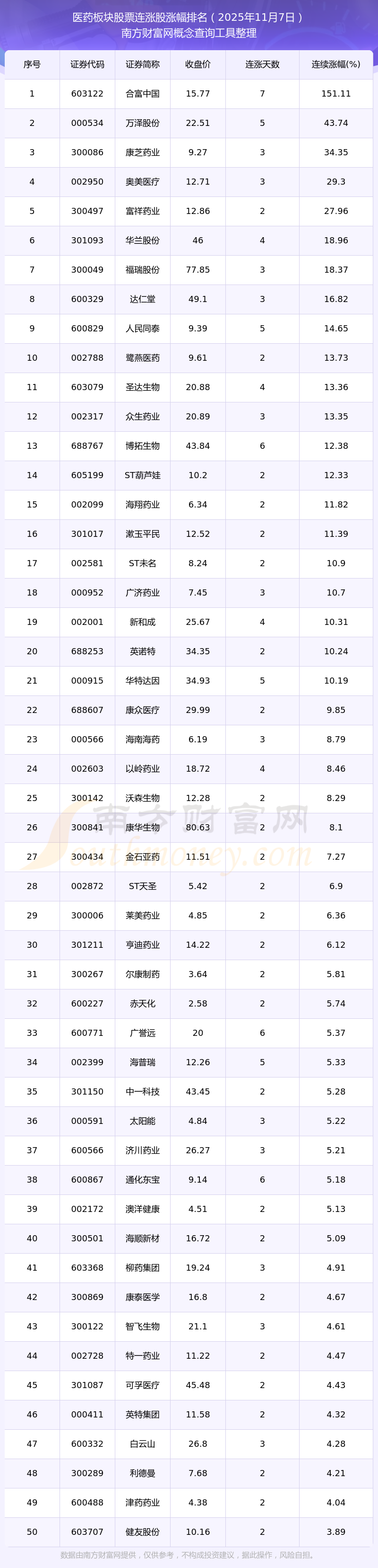 根據(jù)南方財(cái)富網(wǎng)概念查詢工具數(shù)據(jù)統(tǒng)計(jì),截止2025年11月7日收盤,醫(yī)藥板塊股票共有97只個(gè)股實(shí)現(xiàn)連漲。其中連續(xù)漲幅較大的個(gè)股有合富中國(guó)、萬(wàn)澤股份、康芝藥業(yè)等,連續(xù)漲幅分別為151.11%、43.74%、34.35%。