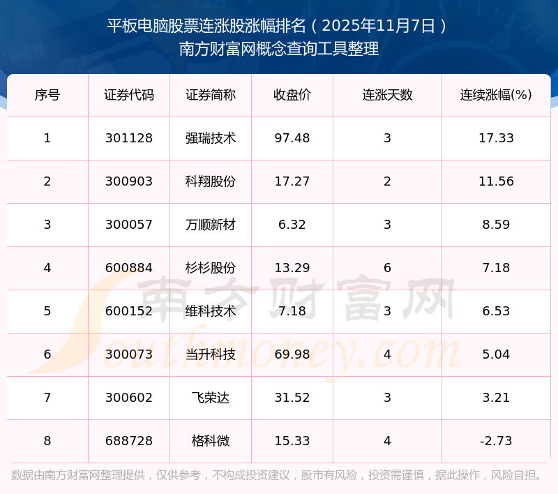 2025年11月7日平板電腦股票連漲股漲幅排名
