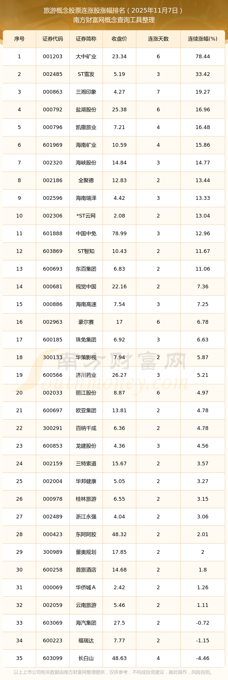 2025年11月7日旅游概念股票連漲股漲幅排名