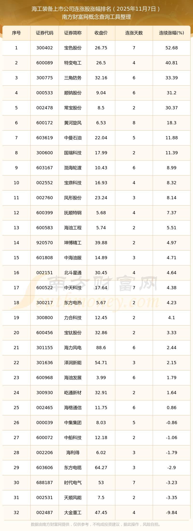 2025年11月7日海工裝備上市公司連漲股票漲幅排名
