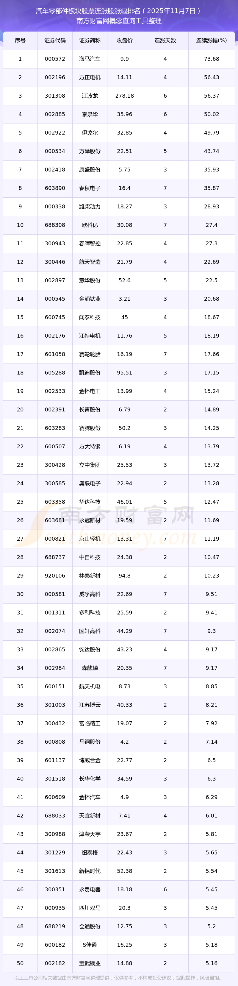 根據(jù)南方財(cái)富網(wǎng)概念查詢工具數(shù)據(jù)統(tǒng)計(jì),截止2025年11月7日收盤,汽車零部件板塊股票共有84只個(gè)股實(shí)現(xiàn)連漲。其中連續(xù)漲幅較大的個(gè)股有海馬汽車、方正電機(jī)、江波龍等,連續(xù)漲幅分別為73.68%、56.43%、56.37%。