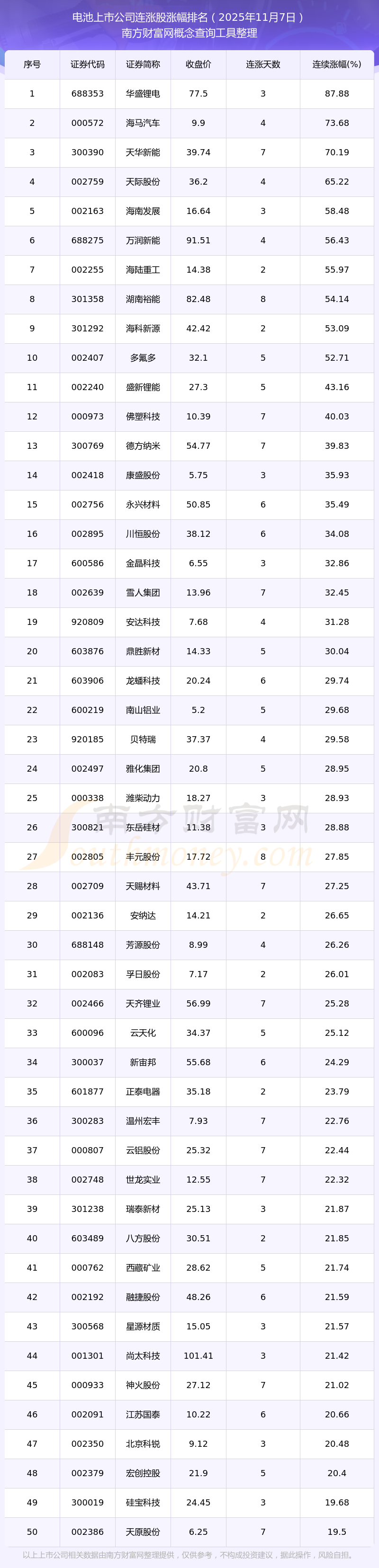 根據(jù)南方財(cái)富網(wǎng)概念查詢工具數(shù)據(jù)統(tǒng)計(jì),截止2025年11月7日收盤,電池上市公司共有240只個(gè)股實(shí)現(xiàn)連漲。其中連續(xù)漲幅較大的個(gè)股有華盛鋰電、海馬汽車、天華新能等,連續(xù)漲幅分別為87.88%、73.68%、70.19%。