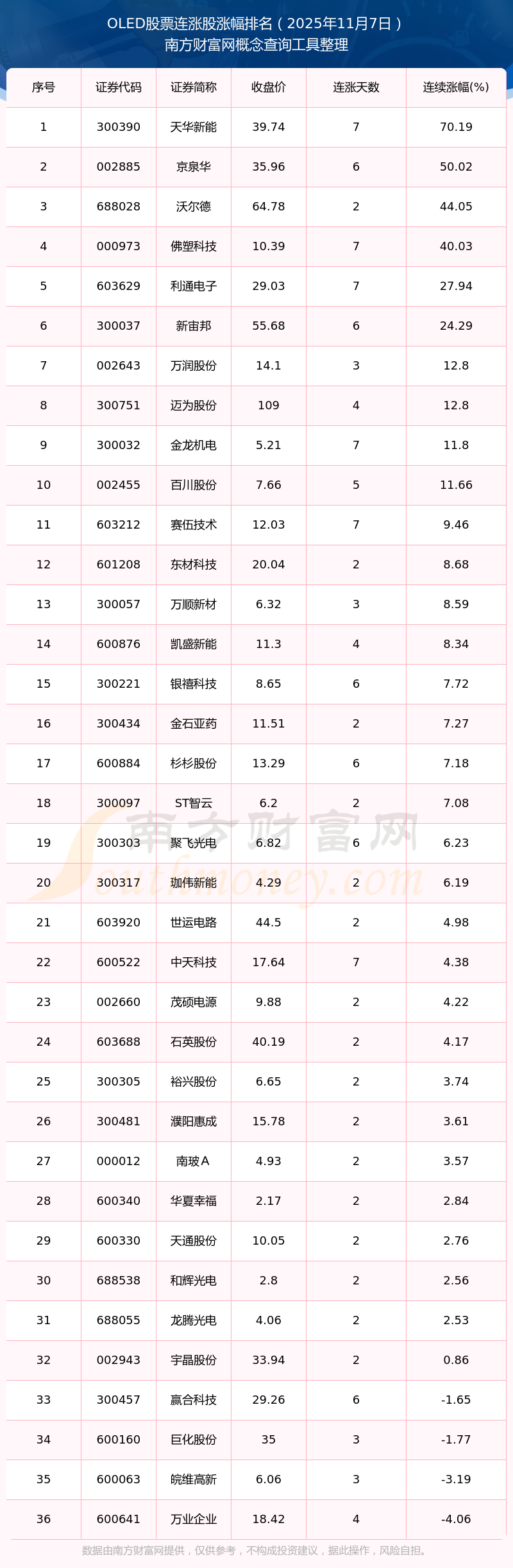 根據(jù)南方財(cái)富網(wǎng)概念查詢工具數(shù)據(jù)統(tǒng)計(jì),截止2025年11月7日收盤,OLED股票共有36只個(gè)股實(shí)現(xiàn)連漲。其中連續(xù)漲幅較大的個(gè)股有天華新能、京泉華、沃爾德等,連續(xù)漲幅分別為70.19%、50.02%、44.05%。