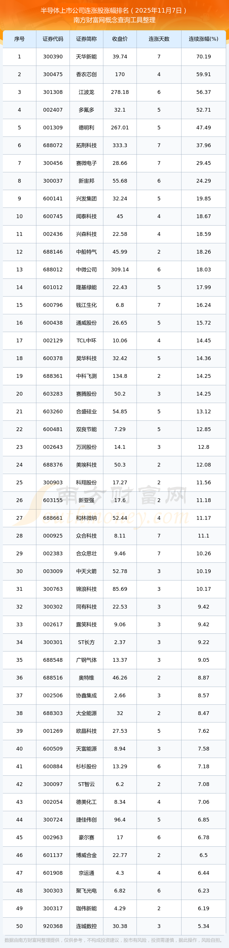 2025年11月7日半導體上市公司連漲股漲幅排名