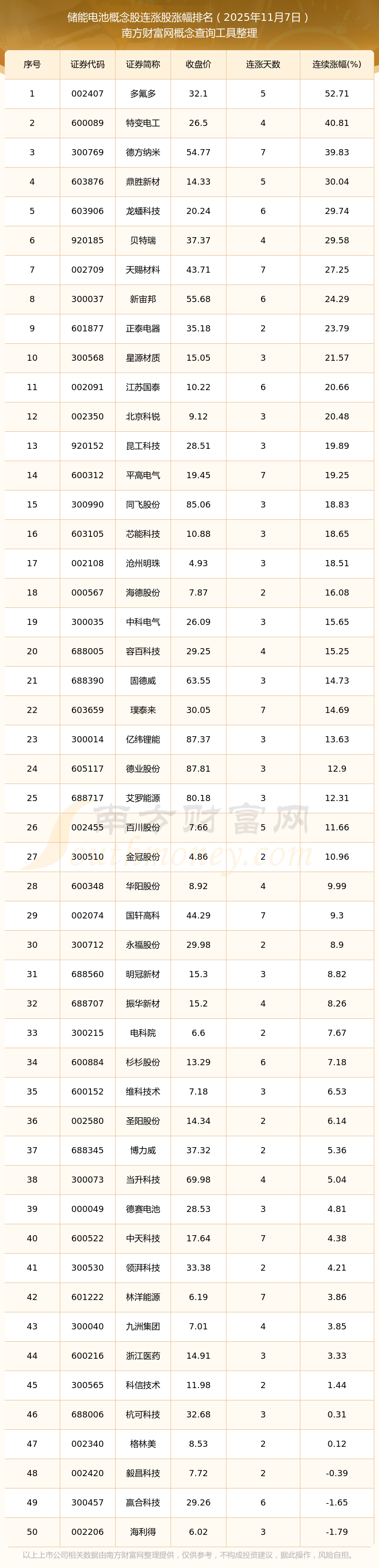 根據(jù)南方財富網(wǎng)概念查詢工具數(shù)據(jù)統(tǒng)計,截止2025年11月7日收盤,儲能電池概念股共有51只個股實現(xiàn)連漲。其中連續(xù)漲幅較大的個股有多氟多、特變電工、德方納米等,連續(xù)漲幅分別為52.71%、40.81%、39.83%。