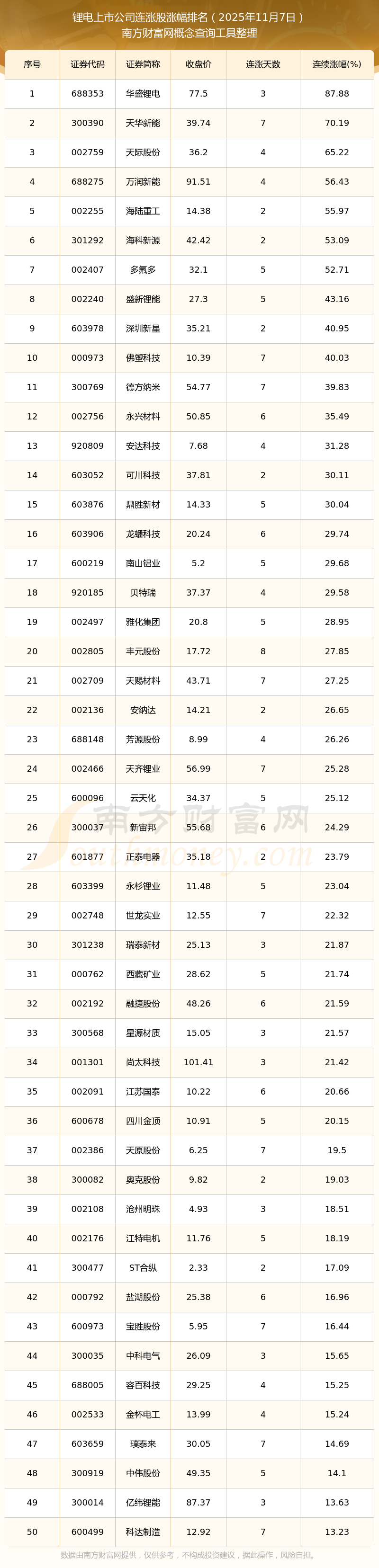 2025年11月7日鋰電上市公司連漲股漲幅排名