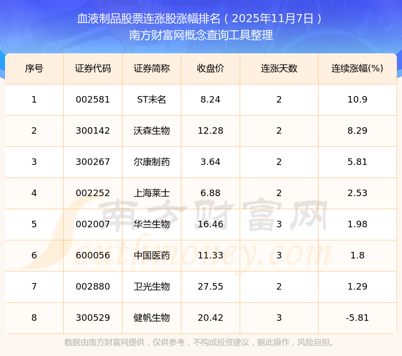 根據(jù)南方財富網(wǎng)概念查詢工具數(shù)據(jù)統(tǒng)計,截止2025年11月7日收盤,血液制品股票共有8只個股實現(xiàn)連漲。其中連續(xù)漲幅較大的個股有ST未名、沃森生物、爾康制藥等,連續(xù)漲幅分別為10.90%、8.29%、5.81%。