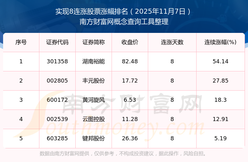 2025年11月7日實現(xiàn)8連漲股票漲幅排名