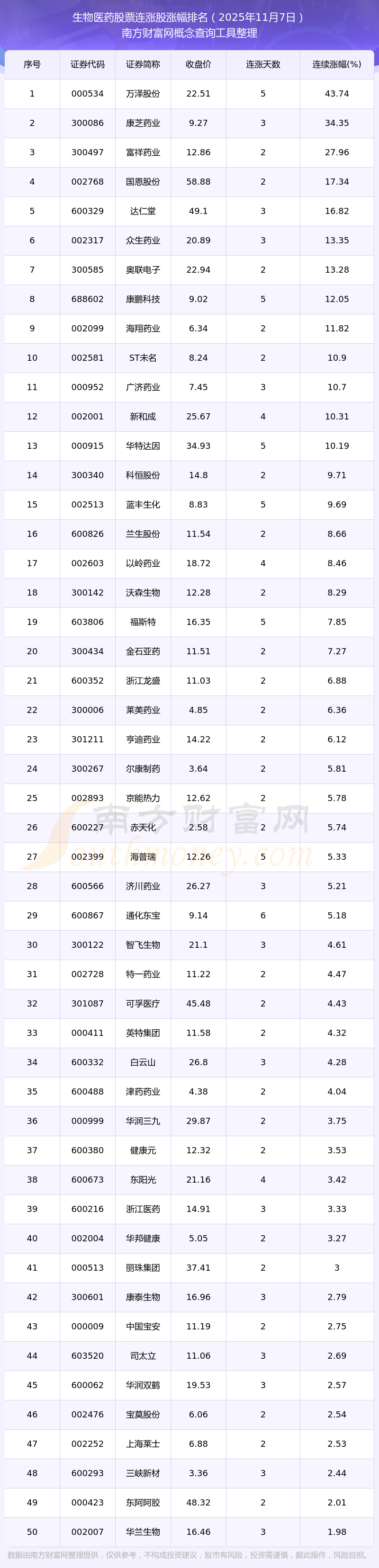 2025年11月7日生物醫(yī)藥股票連漲股漲幅排名